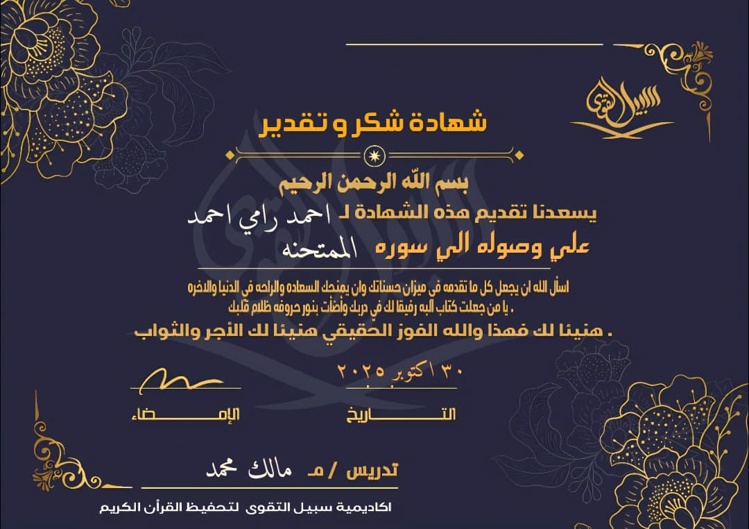 شهادة تقدير وتكريم تتقدّم أكاديمية سبيل التقوى بخالص التهاني والتبريكات للطالب المجتهد أح...