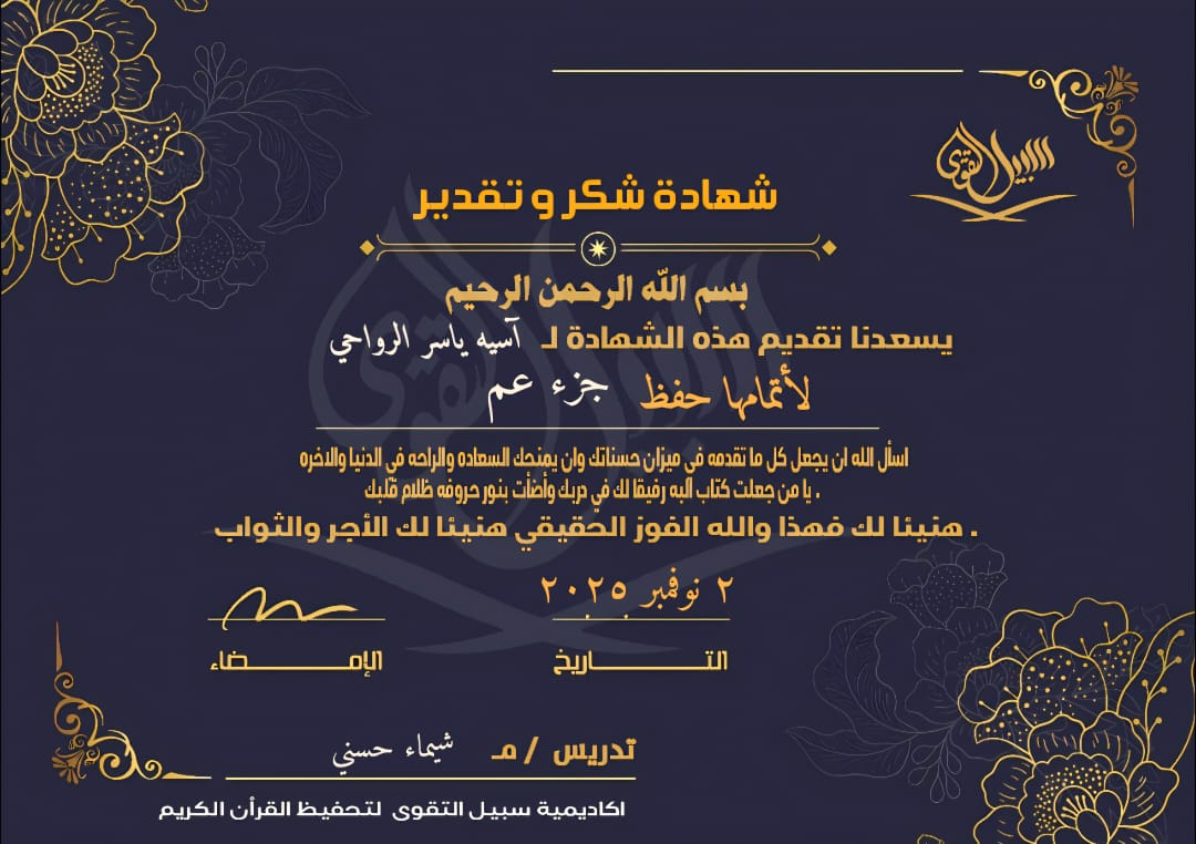 شهادة تقدير وتكريم 🌟تتشرف أكاديمية سبيل التقوى بأن تتقدّم بأطيب التهاني وأصدق مشاعر الفخر للطالب الم...