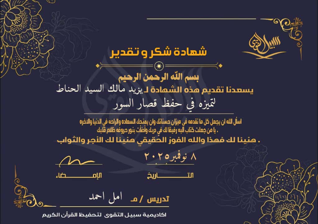 شهادة تقدير وتكريم 🌟تتشرف أكاديمية سبيل التقوى بأن تتقدّم بأطيب التهاني وأصدق مشاعر الفخر للطالب الم...